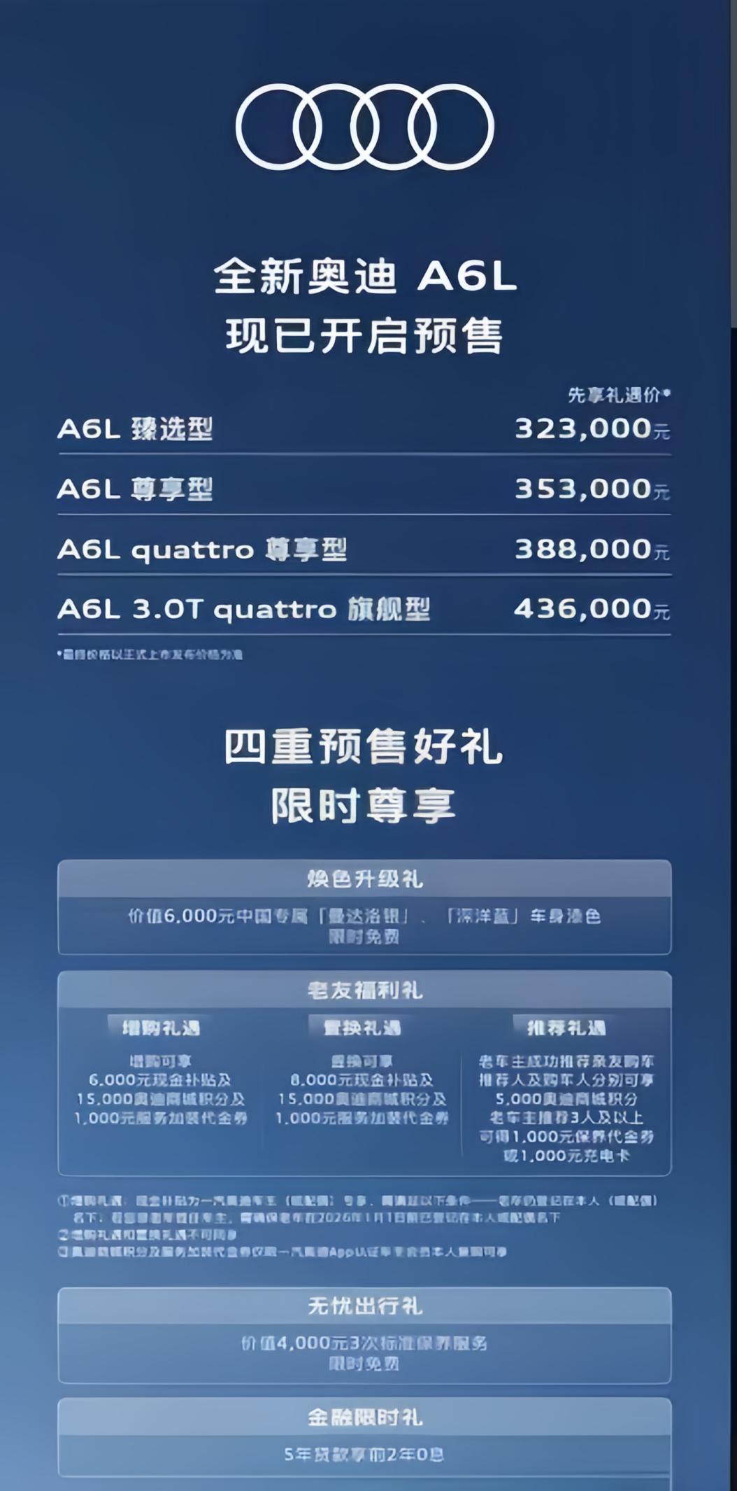 据一汽奥迪官方音问,全新奥迪A6L将于2026年3月25日精采上市。新车此前已开启预售,共推出4款树立车型,先享礼遇价区间为32.3万元至43.6万元。看成换代车型J9九游会体育,新车基于PPC豪华燃油车平台打造,在盘算推算、智能、能源及尺寸方面均有权臣升级。