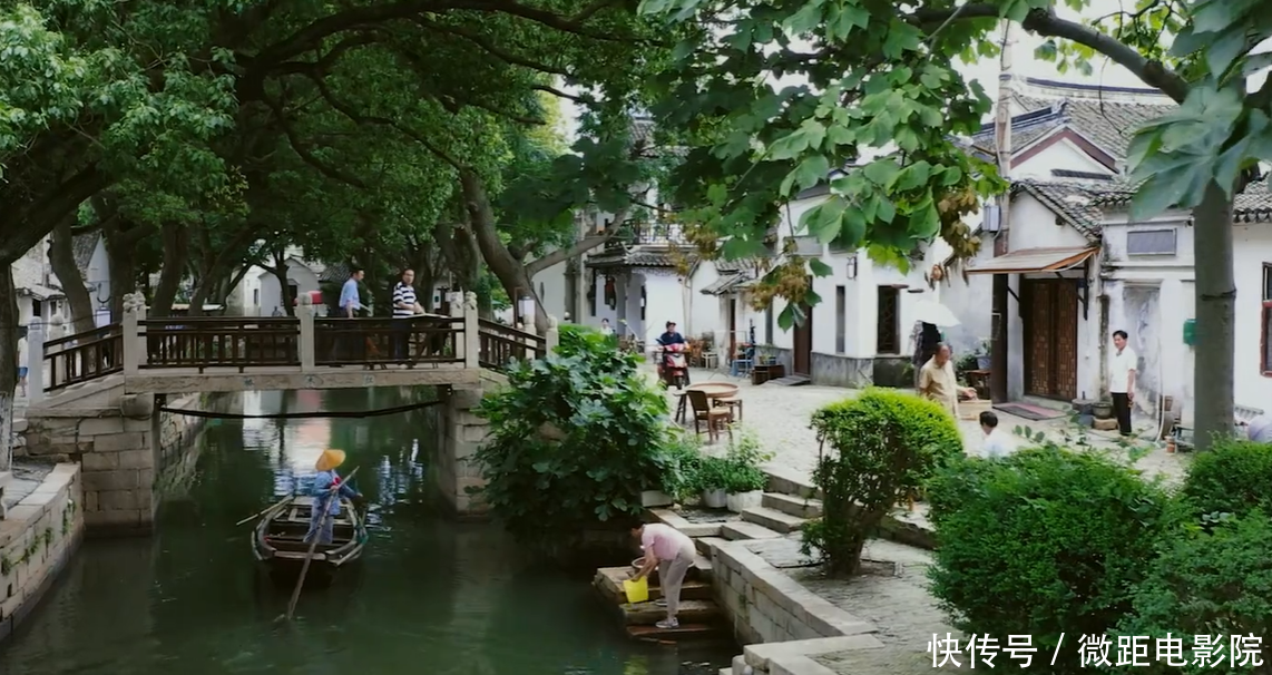 在苏州古镇,船夫划桨、草木恒生,一旁的大叔骑着略旧的电动车驶过,一片小镇的温馨协调娇傲。