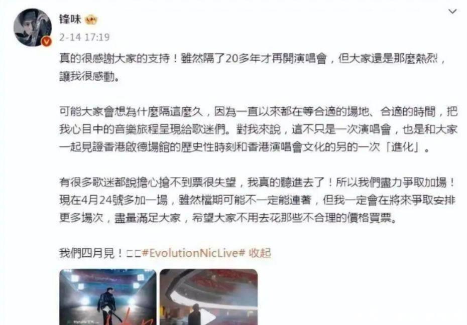 见此景色,谢霆锋吓的马上发文,称依然在辛勤争取更多场次中,从原定的25至26日的演唱会,提前至24日就运行。