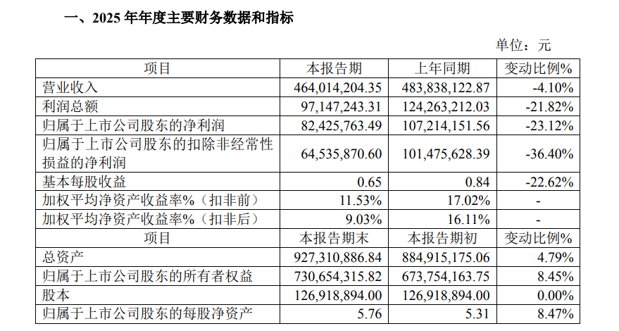2月25日,漯河利通液压科技股份有限公司(证券代码:920225,证券简称:利通科技)发布2025年年度功绩快报。公告败露,2025年度公司瞻望收场营业收入464,014,204.35元,同比下跌4.10%;包摄于上市公司股东的净利润为82,425,763.49元,同比下跌23.12%;包摄于上市公司股东的扣除非庸俗性损益的净利润为64,535,870.60元,同比降幅达36.40%。基本每股收益为0.65元,较上年同时的0.84元下跌22.62%。