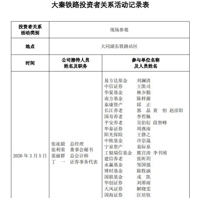 3月7日,大秦铁路(601006)发布投资者揣测行为记载表。记载表泄漏,3月5日,公司接收了多家机构的调研,回答了公司净利润着落的主要影响身分等问题。