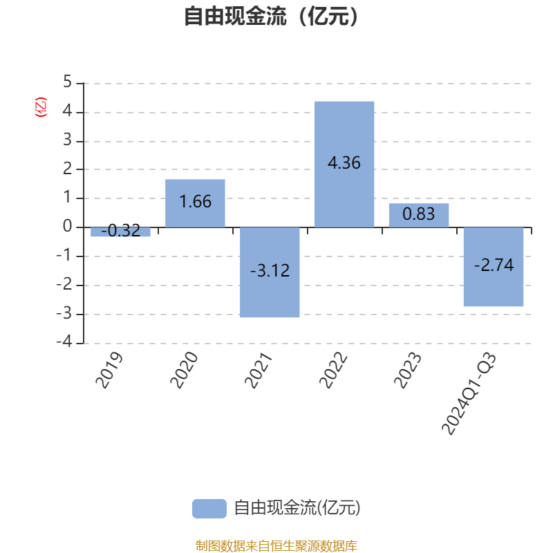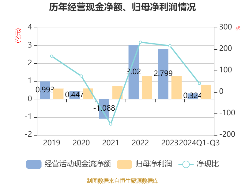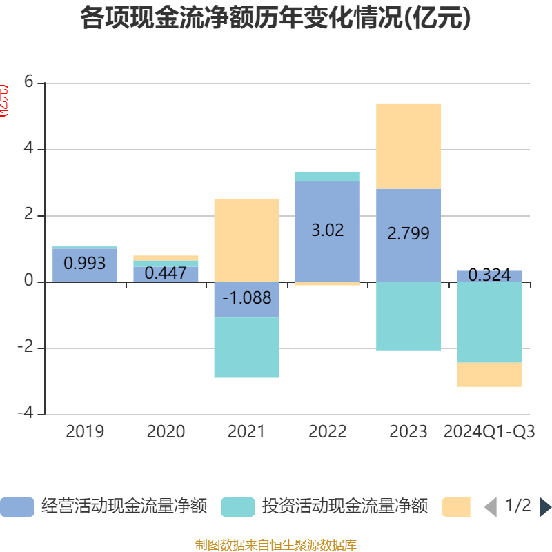 2024年前三季度,公司筹画活动现款流净额为3244.51万元,同比着落85.35%;筹资活动现款流净额-7332.12万元,同比减少1719.57万元;投资活动现款流净额-2.45亿元,上年同时为-2.26亿元。