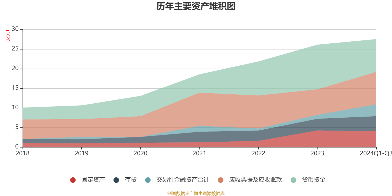 钞票要紧变化方面,为止2024年三季度末,公司货币资金较上年末减少26.4%,占公司总钞票比重着落11.51个百分点;交游性金融钞票共计较上年末增多203.14%,占公司总钞票比重飞腾6.38个百分点;应收单据及应收账款较上年末增多26.6%,占公司总钞票比重飞腾4.47个百分点;存货较上年末增多28.61%,占公司总钞票比重飞腾2.23个百分点。