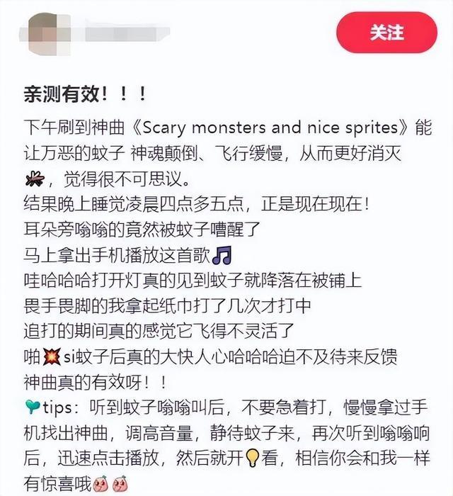 据悉,早前有商量发现,通过音箱高声外放电子乐《Scary Monsters and Nice Sprites》确乎在一定进程上会影响蚊子关于猎物的判断,使进食次数和交配频率皆领路下落了。